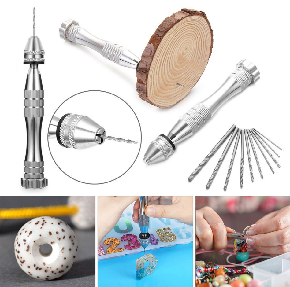 Handheld manual drill with twist bit for precise control over small resin projects.