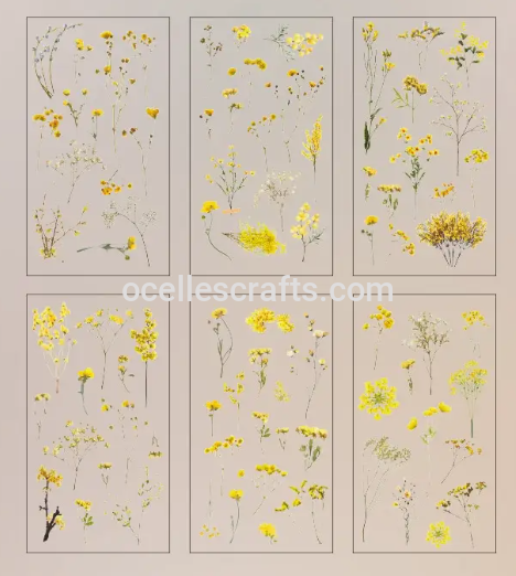 Warm-toned yellow sticker sheet with floral and sun-inspired prints.